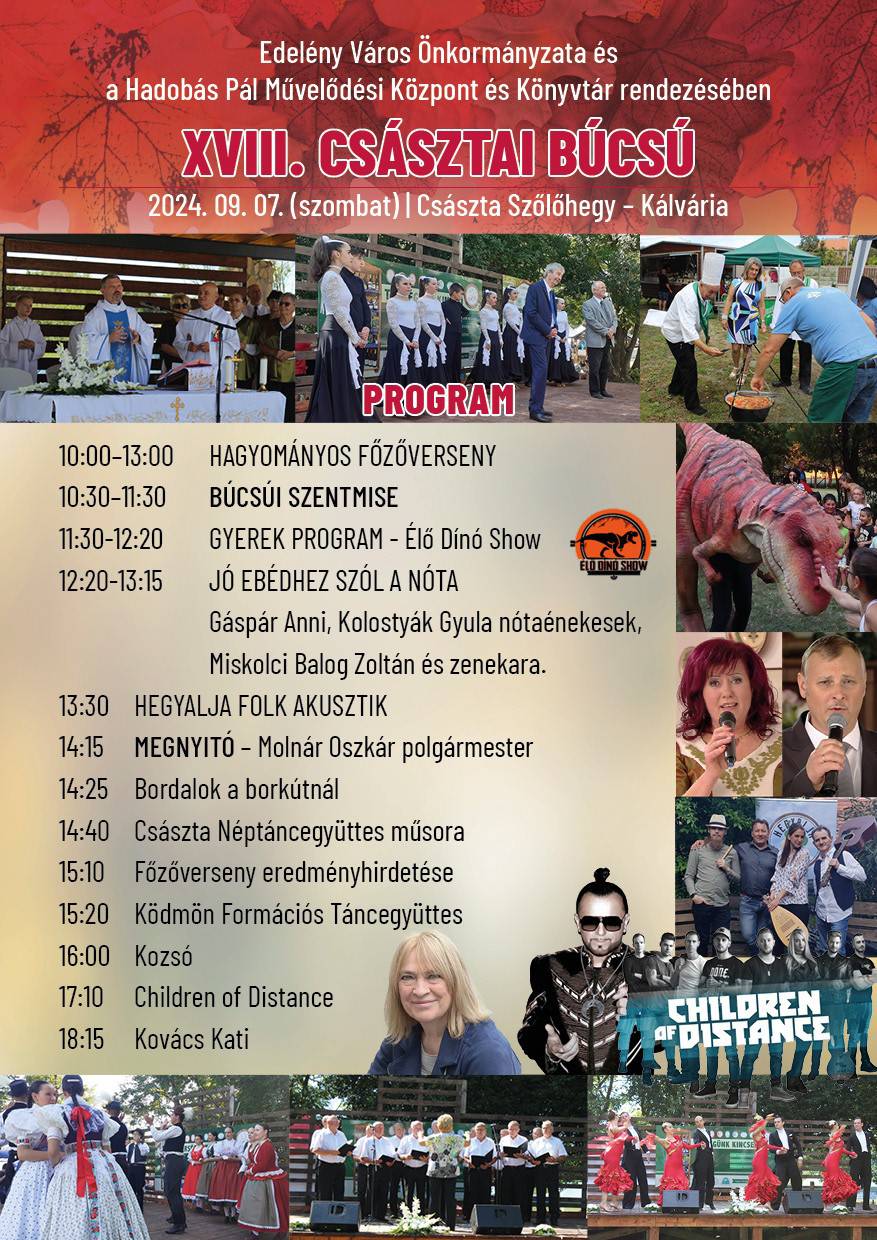 A XVIII Császtai Búcsú 2024. szeptember 7-én kerül megrendezésre Edelényben a Császta Szőlőhegyen.
